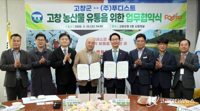 코리아타임뉴스 전북취재본부 | 고창군이 25일 군청에서 고인돌휴게소 운영사인 ㈜푸디스트와 업무협약을 체결하고, 지역인재 채용과 농특산품 마케팅 등에 협력하기로 했다.