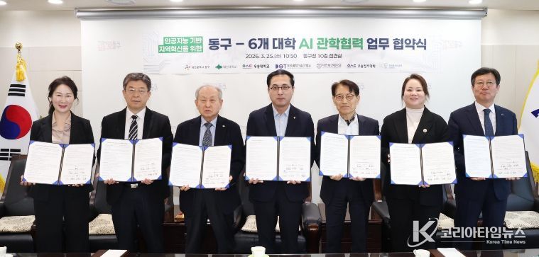 코리아타임뉴스 대전취재본부 | 대전 동구는 25일 대전대학교, 우송대학교, 대전과학기술대학교, 대전보건대학교, 우송정보대학, 한국폴리텍Ⅳ대학 대전캠퍼스와 ‘인공지능(AI) 기반 지역혁신을 위한 관학협력 업무협약’을 체결했다고 밝혔다.