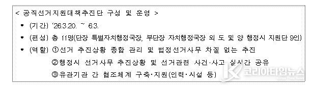소통청렴담당관이 총괄하고 3개 반 10명의 감찰 인력이 투입되며, 공직자의 선거중립 의무 위반, 민생현안 방치, 선심성 예산집행, 공직기강 해이 등을 집중 점검한다.