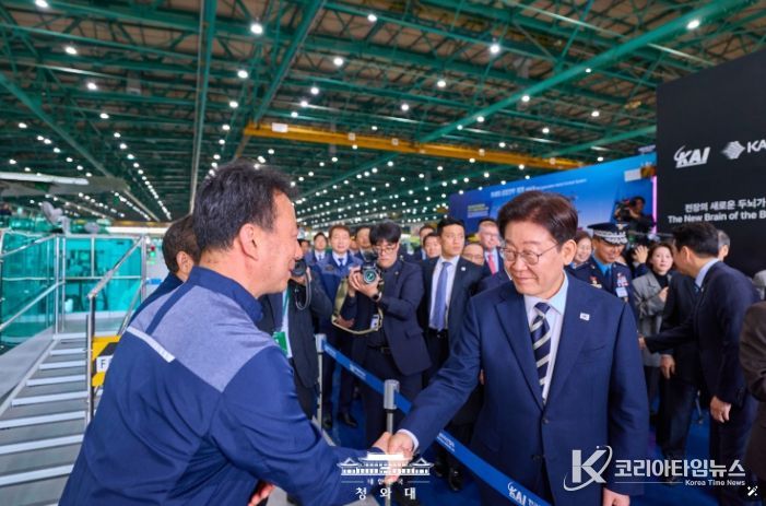 코리아타임뉴스 이아름 기자 | 이재명 대통령은 25일 오후 한국항공우주산업(KAI)에서 열린 KF-21 양산 1호기 출고식에 이어 고정익 생산 현장을 시찰했다.