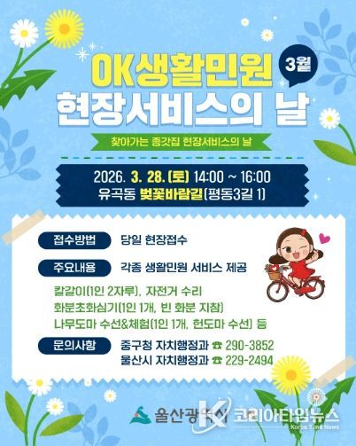 코리아타임뉴스 울산취재본부 | 울산시는 ‘2026년 오케이(OK)생활민원 현장서비스의 날’을 오는 3월 28일 중구 유곡동을 시작으로 본격 개시한다고 밝혔다.