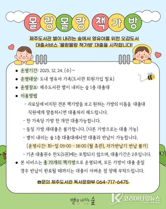 코리아타임뉴스 사회팀 | 제주도교육청 제주도서관이 운영 중인 영유아 오감 도서 대출서비스 ‘몰랑몰랑 책가방’이 이용자들의 꾸준한 호응을 얻고 있다.