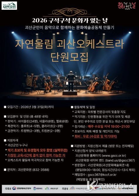 코리아타임뉴스 박찬식 기자 | 충북 괴산문화원은 문화체육관광부와 충청북도, 괴산군이 후원하는 2026년 ‘구석구석 문화가 있는 날’ 사업과 연계해 ‘자연울림 괴산오케스트라’를 창단하고 함께할 단원을 모집한다고 27일 밝혔다.