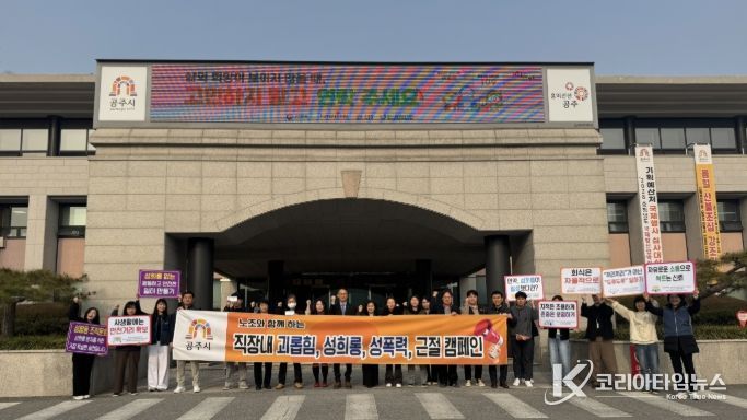 코리아타임뉴스 충남취재본부 | 공주시는 27일 시청 본관 로비에서 공주시청 공무원노동조합과 공무직노동조합과 함께 ‘2026년 직장 내 폭력 예방 캠페인’을 실시했다.