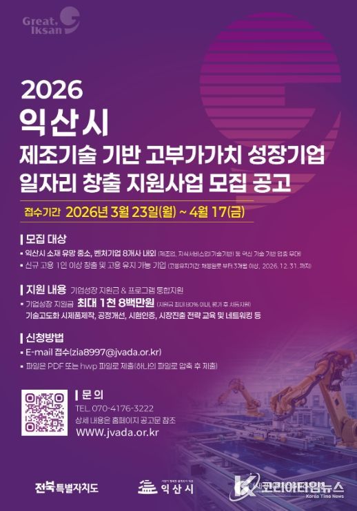 한편, 이번 사업은 전북특별자치도 공모에 선정돼 추진하는 민관 협력 사업으로, 자세한 내용은 익산시 누리집이나 ㈔전북벤처산업발전협의회 누리집 공고문을 통해 확인하면 된다.