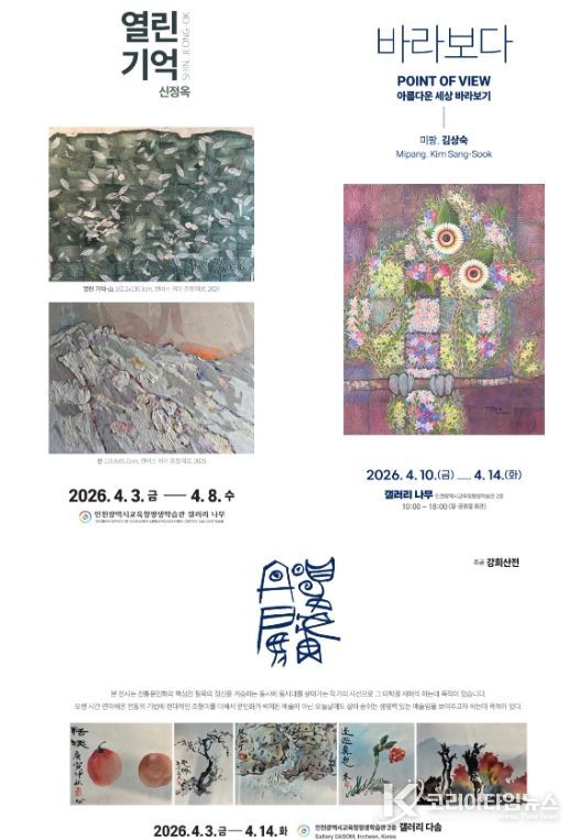 코리아타임뉴스 사회팀 | 인천광역시교육청평생학습관은 오는 4월 3일부터 14일까지 관내 갤러리 ‘나무’와 ‘다솜’에서 ‘열린 기억, 바라보다’와 ‘추공 강희산전’을 개최한다.