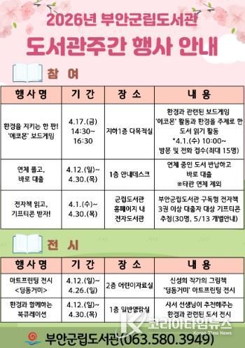 코리아타임뉴스 전북취재본부 | 부안군립도서관은 2026년 도서관의 날(4월 12일)과 도서관주간(4월 12~18일)을 맞아 지역 주민들을 위한 다채로운 독서 문화 행사를 운영한다고 밝혔다.