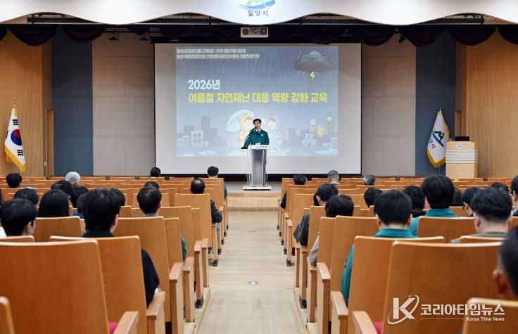코리아타임뉴스 경남취재본부 | 경남 밀양시는 다가오는 여름철 풍수해 등 자연재난에 선제적으로 대응하고, 시민의 소중한 생명과 재산을 보호하기 위해 27일 시청 대강당에서 ‘여름철 자연재난 대응 역량 강화 교육’을 실시했다.