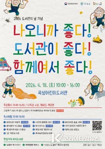 코리아타임뉴스 전남취재본부 | 곡성군이 오는 4월 18일 곡성어린이도서관에서 ‘나오니까 좋다! 도서관이 좋다! 함께여서 좋다!’를 슬로건으로 한 도서관의 날 기념행사를 연다.