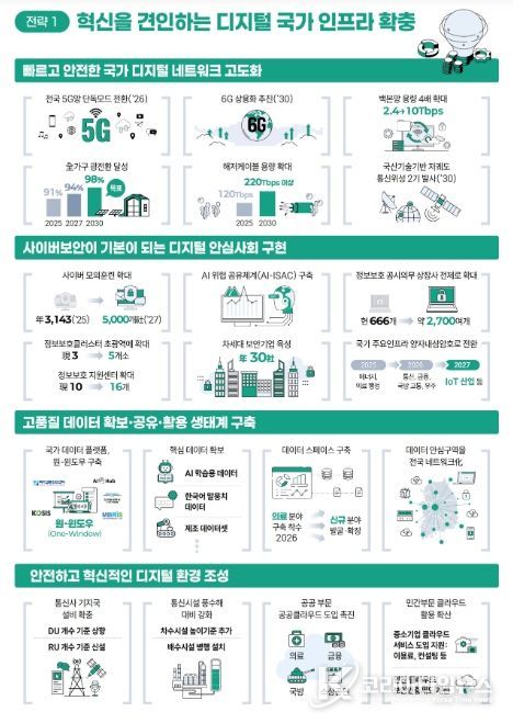 (①디지털 기반 시설'인프라' 확충) 전국 5세대 이동통신망을 단독 모드(SA)로 전환하는 등 5세대 이동통신을 고도화하고, 차세대 6세대 이동통신 상용화 기술을 개발하여 2030년 6세대 이동통신 상용화를 추진하는 등 국가 디지털 연결망(네트워크)을 고도화해 나갈 계획이다. 또한, 정보 보호 관리체계를 강화하고 공공‧민간 사이버보안 역량 강화를 위한 제도개선을 추진하는 등 사이버 위협으로부터 안전한 디지털 안심 사회를 구현하는 한편, 국가 데이터 통합 온라인 체제 기반(플랫폼)을 구축하는 등 고품질 데이터 생태계를 조성한다.