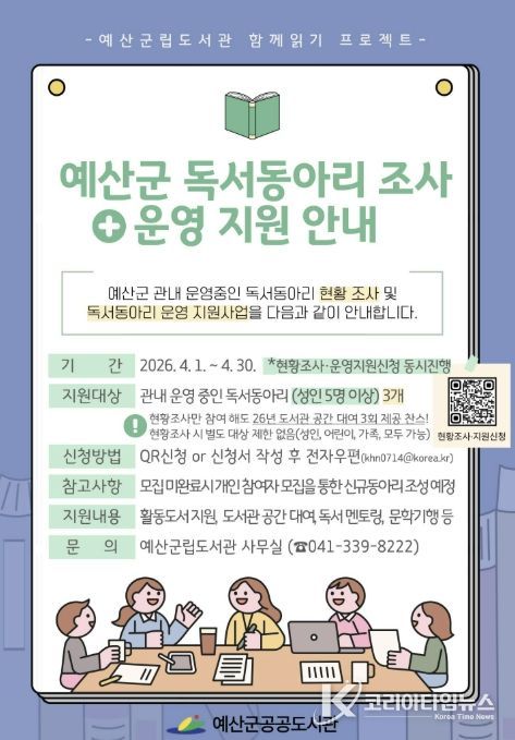 코리아타임뉴스 김택호 기자 | 예산군 공공도서관은 지역 내 독서동아리 활동을 체계적으로 지원하고 독서공동체 기반을 넓히기 위해 ‘2026 독서동아리 운영 지원사업’을 추진한다.