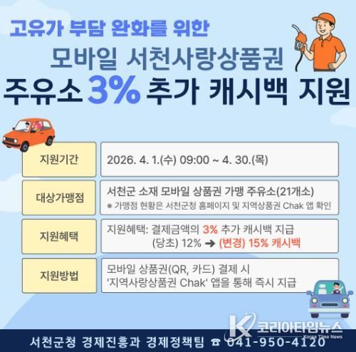 코리아타임뉴스 충남취재본부 | 서천군이 최근 유가 상승에 따른 군민들의 생활비 부담을 덜기 위해 주유소 이용 시 모바일 서천사랑상품권 추가 캐시백 지원에 나선다.