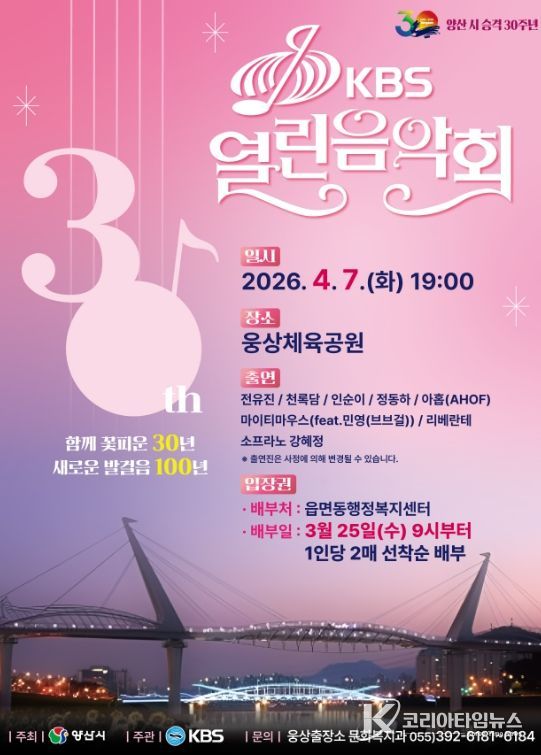 코리아타임뉴스 오영주 기자 | 양산시가 시 승격 30주년을 기념하고 ‘2026 양산방문의 해’를 널리 알리기 위해 4월 7일(화) 저녁 7시 웅상체육공원 축구장에서‘KBS 열린음악회’를 개최한다고 밝혔다.