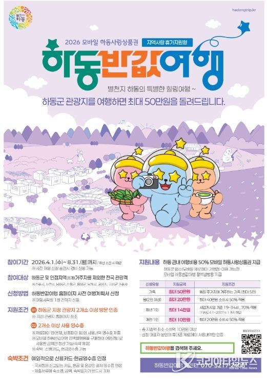사전 신청은 4월 1일부터 ‘하동 반값여행’ 공식 홈페이지를 통해 가능하며, 지원 조건과 신청 절차, 유의 사항 등 세부 내용도 해당 플랫폼에서 확인할 수 있다.