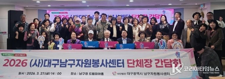 코리아타임뉴스 노승선 기자 | (사)대구남구자원봉사센터(이사장 이흥우)는 지난 27일 남구청 드림피아홀에서 ‘2026 자원봉사 단체장 간담회’를 개최했다.