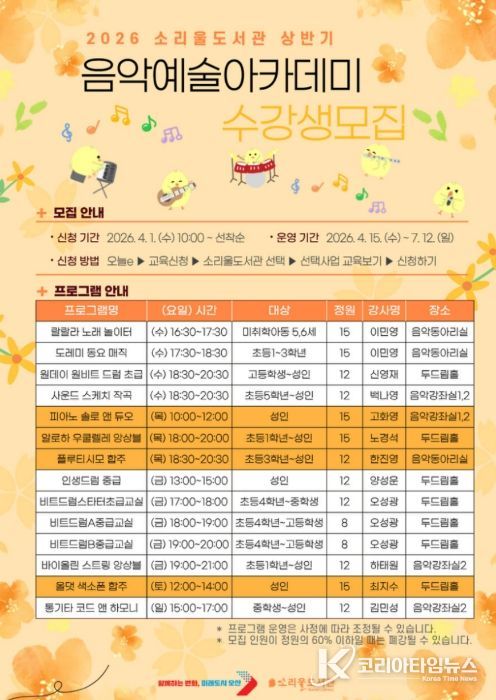 코리아타임뉴스 윤광희 기자 | 오산시 소리울도서관은 시민들의 예술적 감수성을 높이고 일상 속 음악 문화를 확산하기 위해 ‘2026년 소리울도서관 상반기 음악예술아카데미’ 수강생을 모집한다고 밝혔다.