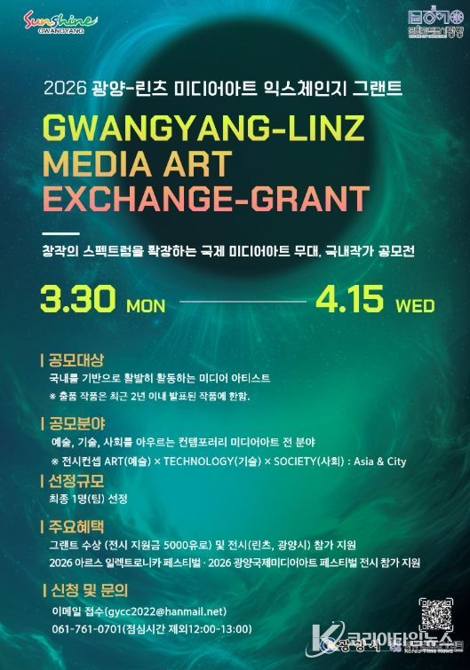 코리아타임뉴스 전남취재본부 | 광양문화도시센터는 오스트리아 린츠와의 예술 교류를 확대하고 국내 미디어아트의 국제 경쟁력을 높이기 위해 '광양-린츠 미디어아트 익스체인지 그랜트(Exchange-Grant)'에 참여할 국내 작가를 공개 모집한다.