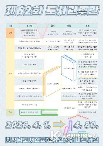 코리아타임뉴스 사회팀 | 충청남도서산교육지원청해미도서관은 제4회 도서관의 날(2026. 4. 12.)과 제62회 도서관 주간(2026. 4. 12.~4. 18.)을 맞아 ‘도서관 속 작은 펼침, 세상을 여는 큰 열림’을 슬로건으로 지역주민과 학생들이 함께할 수 있는 다양한 독서문화행사를 운영한다.