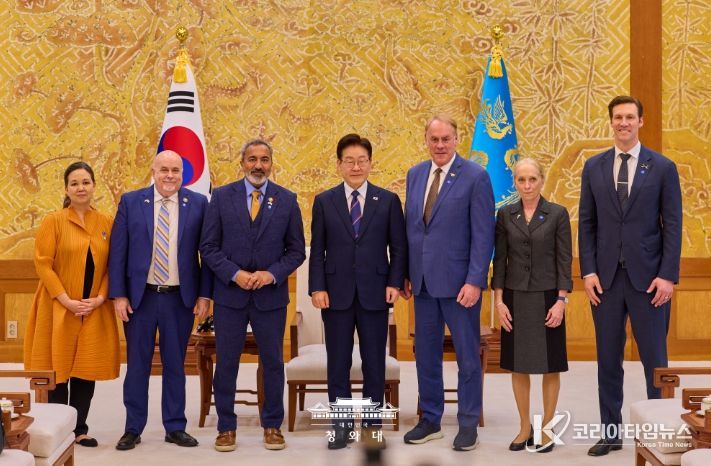 코리아타임뉴스 이아름 기자 | 이재명 대통령은 3월 31일 오후 청와대에서 아미 베라(Ami Bera) 하원 동아태소위원회 간사 등 공화·민주 양당 의원으로 구성된 미국 의회 코리아스터디그룹 대표단을 접견하고 최근 중동 전쟁, 한미관계, 한반도 문제 등에 대해 의견을 나눴다.