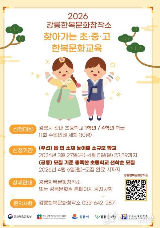 코리아타임뉴스 이아름 기자 | 강릉한복문화창작소는 2026 찾아가는 초중고 한복문화 교육에 참여할 초등학교를 모집한다.