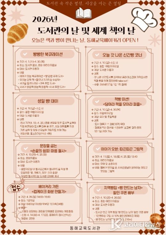 코리아타임뉴스 이아름 기자 | 동해교육도서관은 4월 12일 도서관의 날과 4월 23일 세계 책의 날을 맞아 ‘오늘은 책과 빵이 만나는 날, 동해교육베이커리 오픈(OPEN)!’을 주제로 지역주민과 함께하는 독서문화 행사를 운영한다.