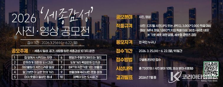 코리아타임뉴스 오영주 기자 | 세종시문화관광재단(대표이사 박영국)은 세종시의 도시 일상 감성과 관광 매력을 담은 ‘2026 세종감성 사진영상 공모전’을 개최한다고 밝혔다.