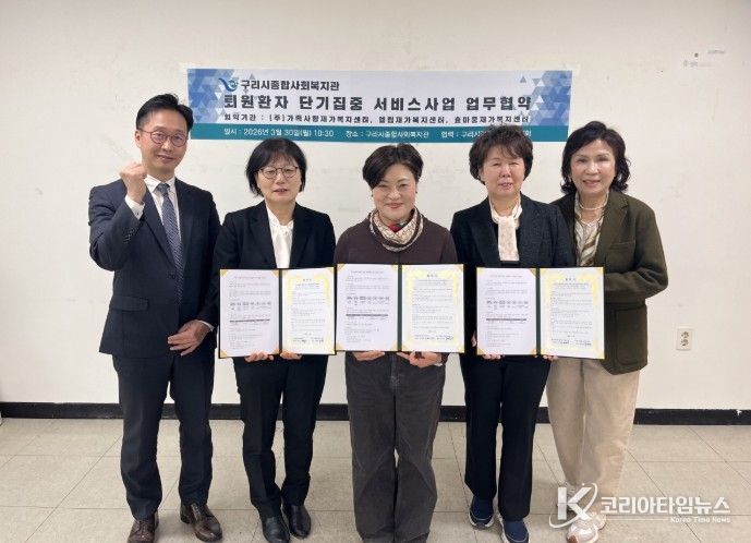 코리아타임뉴스 경기취재본부 | 구리시종합사회복지관은 3월 30일 구리시장기요양기관협회와의 협력을 바탕으로 ㈜가족사랑재가복지센터, 엘림재가복지센터, 효마중재가복지센터 등 3개 기관과 ‘퇴원 환자 단기 집중 서비스’ 업무협약을 체결했다.