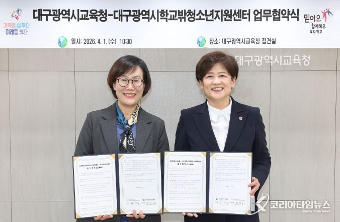 코리아타임뉴스 사회팀 | 대구시교육청은 4월 1일 시교육청 접견실에서 대구학교밖청소년지원센터(센터장 최미송)와 ‘학교 밖 청소년 지원을 위한 업무협약’을 체결했다.