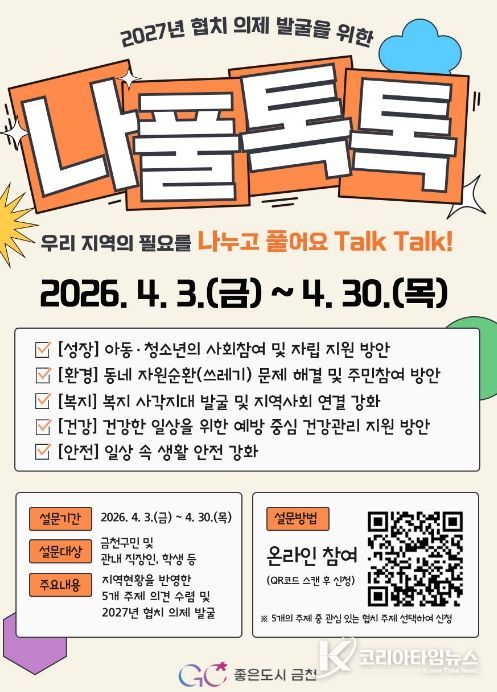 코리아타임뉴스 윤광희 기자 | 금천구는 4월 3일부터 30일까지 온라인 플랫폼을 통해 주민 참여형 공론장인 ‘나풀톡톡(나누고 풀어요 Talk Talk)’을 운영한다고 밝혔다.