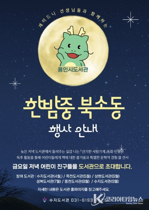 코리아타임뉴스 사회팀 | 용인특례시 서부도서관은 수지‧죽전‧상현‧성복‧동천도서관에서 야간 독서문화 프로그램 ‘한밤중 북소동’을 운영한다고 25일 밝혔다.
