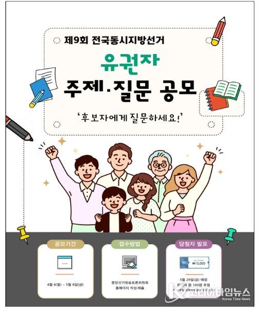 코리아타임뉴스 김택호 기자 | 중앙선거방송토론위원회는 제9회 전국동시지방선거 후보자토론회에서 토론주제와 질문사항 선정에 활용하기 위해 4월 6일부터 ‘유권자 주제·질문 공모’를 실시한다고 밝혔다.