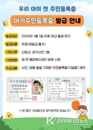 코리아타임뉴스 오영주 기자 | 거창군은 소중한 아기의 출생을 기념하고 출산 장려를 위한 사회적 분위기를 조성하기 위해, 지난 2025년부터 시행 중인 ‘아기 주민등록증’ 무료 발급 서비스를 올해도 지속 추진하고 있다.