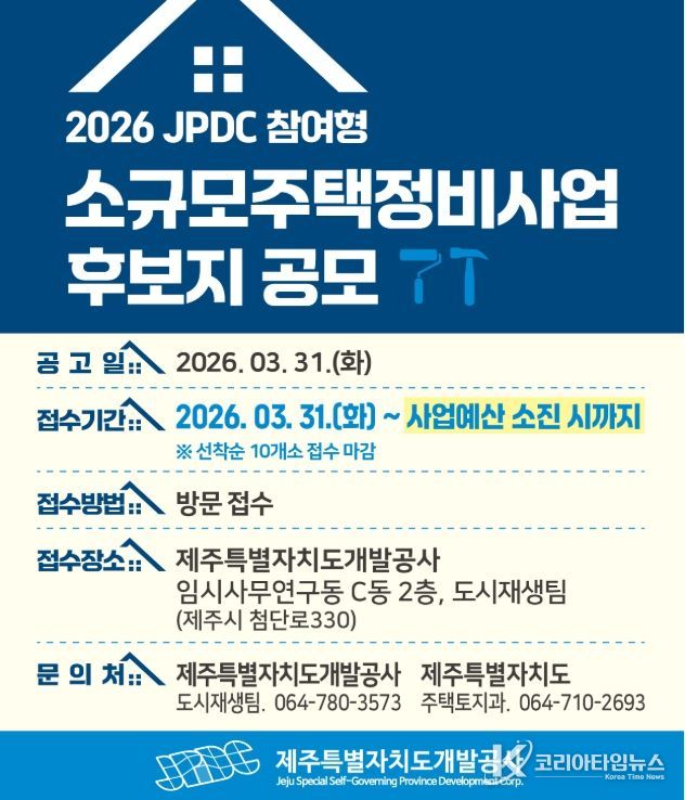 코리아타임뉴스 노승선 기자 | 제주특별자치도와 제주특별자치도개발공사(사장 백경훈)는 대규모 정비사업 추진이 어려운 노후 주거지의 환경을 개선하고, 양질의 주택공급을 확대하기 위해 작년에 이어 올해에도 ‘JPDC참여형 소규모주택정비사업 신규 후보지 발굴 공모’를 실시한다고 밝혔다.