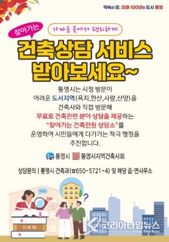 코리아타임뉴스 오영주 기자 | 통영시는 경제적, 시간적 부담으로 인해 시청 방문이 어려운 도서지역(욕지, 한산, 사량, 산양) 시민을 대상으로 건축사와 직접 방문해 무료로 건축 관련 분야 상담을 제공하는 ‘찾아가는 건축민원 상담실’을 운영해 시민들에게 다가가는 적극행정을 추진한다고 2일 밝혔다.