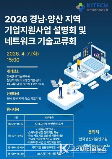 코리아타임뉴스 오영주 기자 | 양산시는 오는 7일 한국생산기술연구원 첨단하이브리드생산기술센터 세미나실에서 지역 산업 발전 촉진과 관내 제조기업의 기술 혁신을 도모하기 위해 ‘2026년 기업지원사업 설명회 및 네트워크 기술교류회’를 개최한다고 밝혔다.