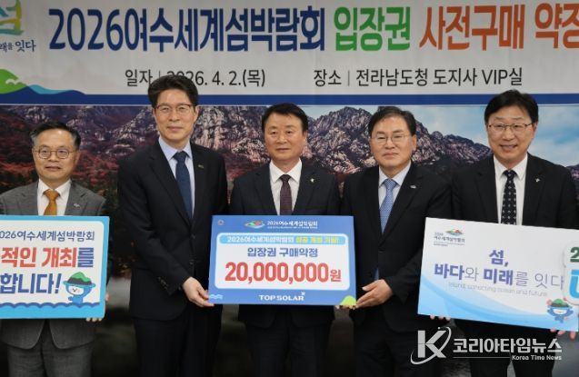 코리아타임뉴스 노승선 기자 | (재)2026여수세계섬박람회조직위원회는 4월 2일 전남도청 VIP실에서 탑솔라㈜와 ‘2026여수세계섬박람회 입장권 구매약정식’을 개최했다고 밝혔다.