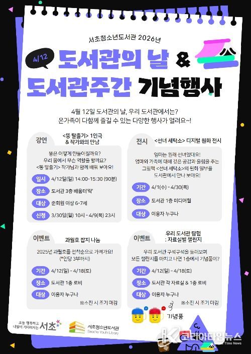 코리아타임뉴스 기동취재팀 | 서울 서초구는 올해 ‘도서관의 날(4월 12일)’과 ‘도서관 주간(4월 12일~18일)’을 맞아 4월 한 달간 구립도서관에서 지역 주민들을 위한 풍성한 독서 문화 프로그램을 운영한다고 밝혔다. 지역 내 10개소 모든 구립도서관에서 행사를 개최해 발길 닿는 가까이 어느 곳에서든 유명 작가의 강연부터 AI 체험까지 도서관별 맞춤형 프로그램이 ‘책 덕후’들을 찾아갈 전망이다.