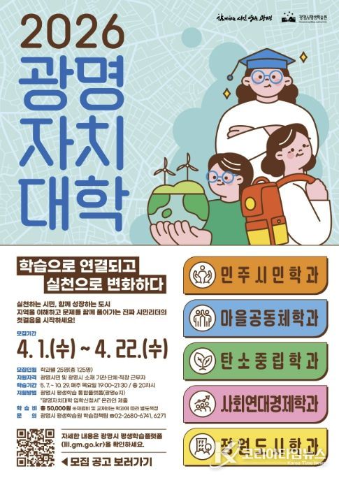 코리아타임뉴스 경기취재본부 | 광명시가 시의 핵심의제인 평생학습 마을리더 양성과정 ‘광명자치대학’ 2026년 신입생 125명을 오는 22일까지 모집한다.
