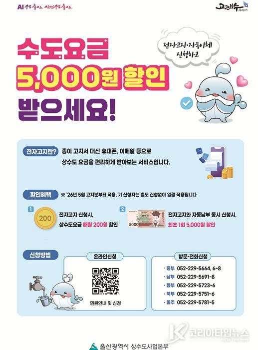 코리아타임뉴스 울산취재본부 | 울산시 상수도사업본부는 시민들의 요금 납부 편의 증진과 종이고지서 사용 감축을 통한 친환경 행정 실현을 위해 오는 5월부터 상수도요금 전자고지 및 자동납부 신청자에게 요금 할인 혜택을 제공한다고 밝혔다.