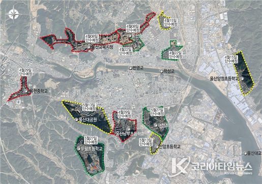 코리아타임뉴스 울산취재본부 | 울산시 상수도사업본부는 오는 4월 7일부터 5월 27일까지(5월 첫째, 셋째 주 제외) 매주 화요일 오후 11시 50분부터 수요일 오전 5시까지 약 5시간 동안 중구·남구·북구 일부 지역에 대한 단수를 순차적으로 진행한다고 밝혔다.