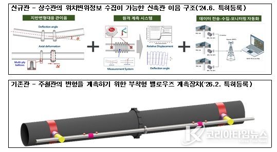 새로운 관로를 매설하면서 신축관을 활용해 센서를 부착하는 ‘상수관의 위치변위정보 수집이 가능한 신축관 이음 구조’와 기존 매설돼 있는 관로 중 일부 침하가 예측되는 구간만 집중 관리할 수 있도록 고안한 ‘주철관의 변형을 계측하기 위한 부착형 벨로우즈 계측장치’ 2가지이다.