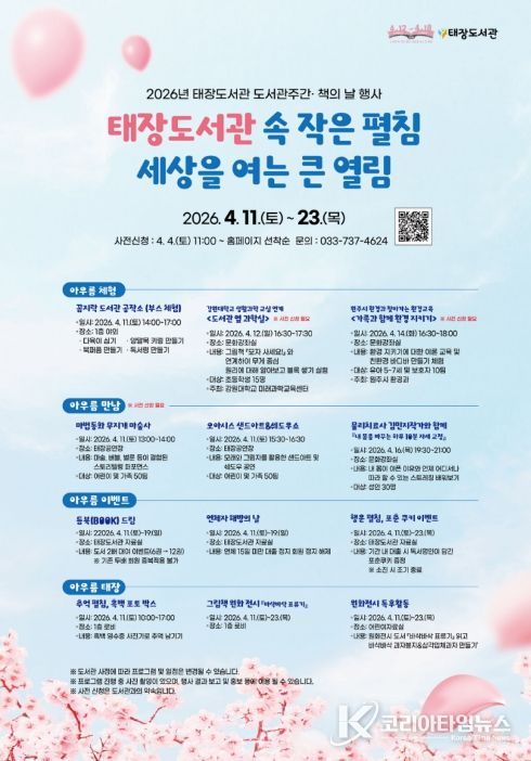 코리아타임뉴스 노승선 기자 | 원주시 태장도서관은 도서관 주간 및 책의 날을 맞이해 오는 11일부터 23일까지 ‘태장도서관 속 작은 펼침, 세상을 여는 큰 열림’을 주제로 다양한 행사를 개최한다.