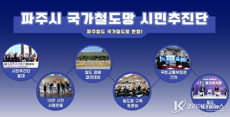 2024년 7월 꾸려진 ‘국가철도망 시민추진단(이하 시민추진단)’은 지하철 3호선 연장, 지티엑스-에이치(GTX-H) 노선, 케이티엑스(KTX) 파주 연장, 통일로선 등 4개 핵심 사업을 국가철도망 계획에 포함시키는 것을 목표로 내걸었다. 추진단이 직접 대대적인 서명운동을 전개해 불과 8개월 만에 10만 명 목표치를 초과 달성해 국토교통부 장관에서 공식 건의서와 함께 서명부를 전달했고, 그 밖에도 범시민 결의대회와 국민청원, 대중공연 무대처럼 풀어낸 ‘철도 콘서트’등 다양한 방식으로 파주 철도망 구축의 필요성을 알리고 정부를 설득하는 데 총력을 기울여왔다.