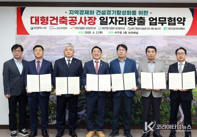 코리아타임뉴스 윤광희 기자 | 대전 서구는 침체된 건설경기 회복과 지역경제 활성화를 위해 구청 보라매실에서 관련 업체 및 협회들과 ‘대형 건축공사장 일자리 창출 업무협약’을 체결했다고 3일 밝혔다.