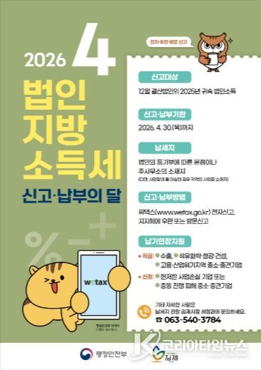 코리아타임뉴스 전북취재본부 | 김제시는 이달 한달 동안 2025년 귀속 법인지방소득세 신고·납부의무 법인이 성실하게 납세의무를 이행할 수 있도록 각 법인에 안내문을 발송하고 시청 홈페이지, SNS 게시 등 다각적인 홍보활동에 나설 예정라고 밝혔다.