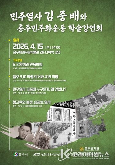 코리아타임뉴스 박찬식 기자 | 충주문화원(원장 유진태)은 ‘민주열사 김중배와 충주 민주화 운동’ 이라는 주제로 오는 15일(수) 오후 2시 충주세계무술박물관 2층 다목적강당에서 학술강연회를 개최한다.
