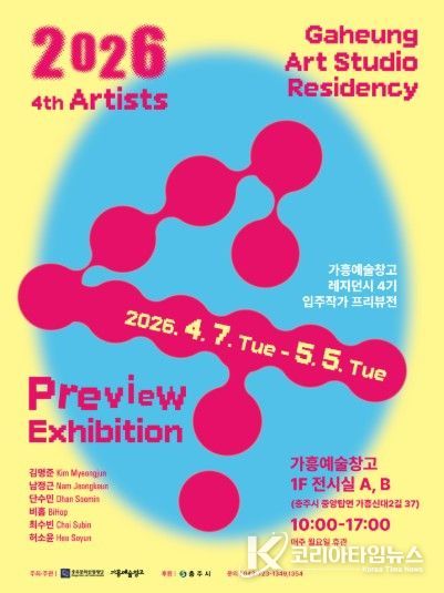 코리아타임뉴스 박찬식 기자 | 충주문화관광재단은 4월 7일부터 5월 5일까지 가흥예술창고에서『2026 가흥예술창고 레지던시 4기 입주작가 프리뷰전』을 개최한다고 밝혔다.