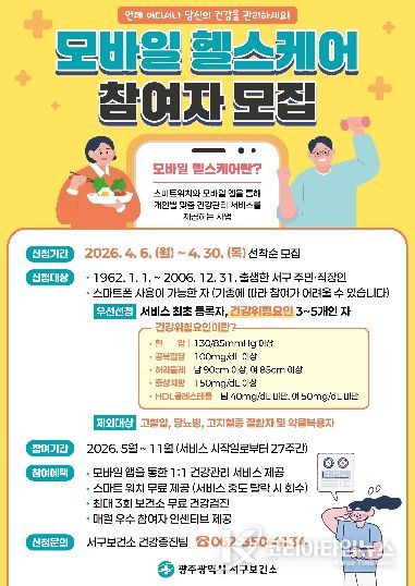 코리아타임뉴스 의료보건팀 | 광주광역시 서구가 지역주민의 건강관리 역량 강화를 위해 정보통신기술(ICT)을 활용한 건강관리 서비스 ‘모바일 헬스케어’ 참여자 125명을 오는 30일까지 선착순 모집한다.