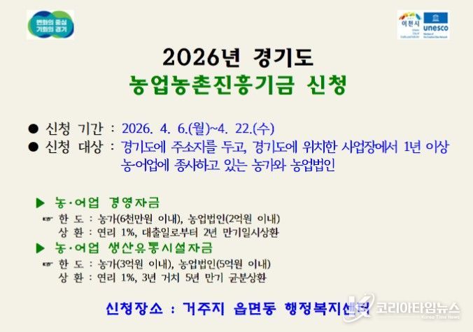 코리아타임뉴스 기동취재팀 | 이천시는 농업인에게 장기·저리 융자 지원을 실시하고 경영안정을 돕기 위해 2026년 2차 경기도 농업농촌진흥기금 농어업 경영자금, 농어업 생산유통시설자금 사업에 대한 신청을 4월 6일부터 접수한다.