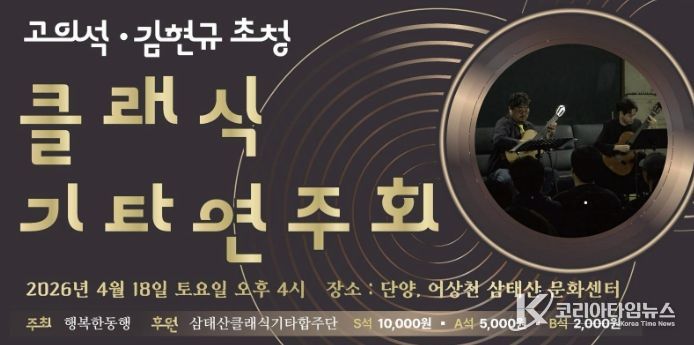 코리아타임뉴스 박찬식 기자 | 단양군 어상천 지역에서 활동하는 삼태산 클래식기타 합주단은 공연기획단체 행복한 동행(대표 홍원의)과 함께 오는 18일 오후 4시 어상천 삼태산문화센터에서 ‘고의석·김현규 초청 클래식기타 연주회’를 개최한다.